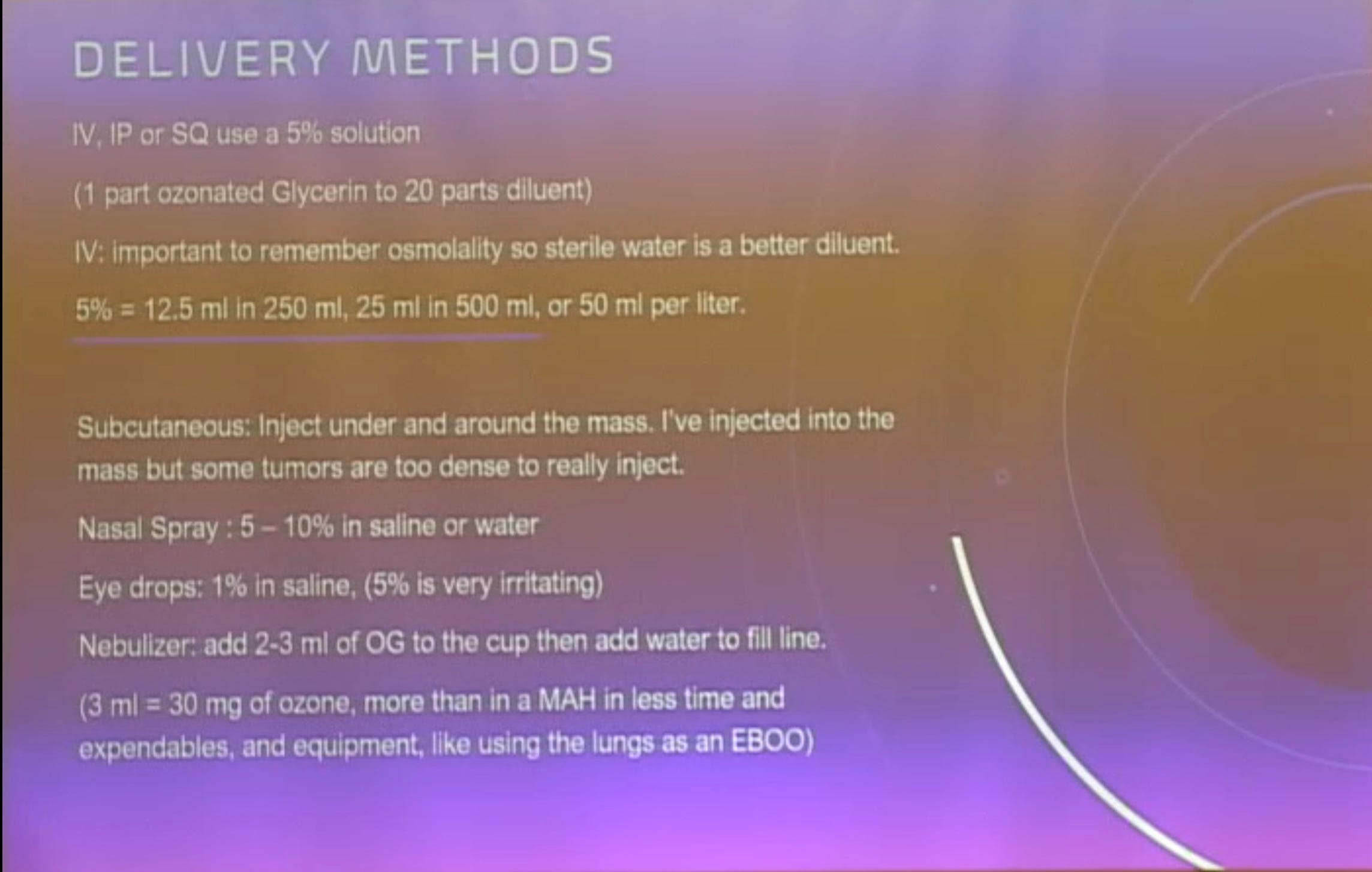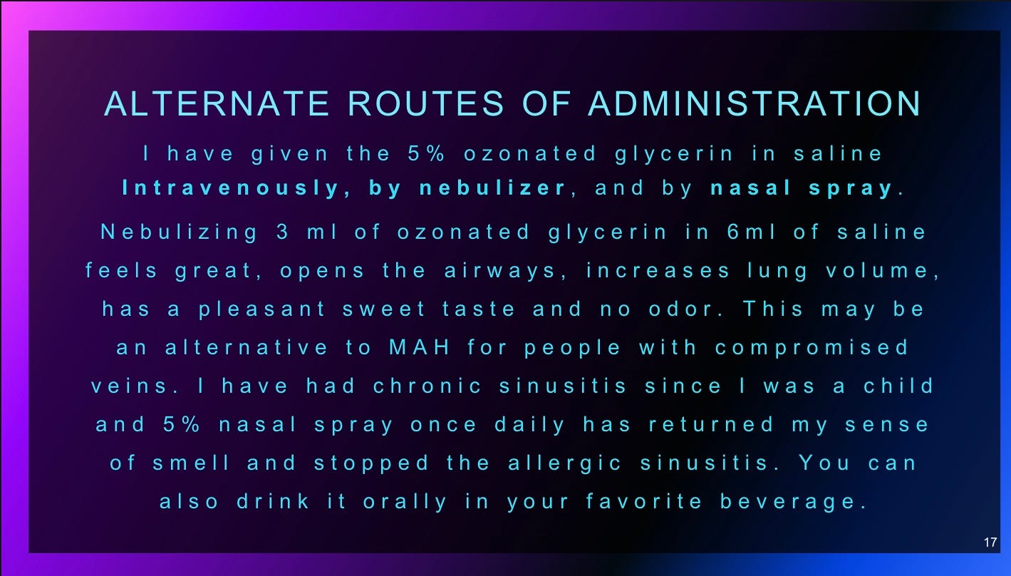 First, regarding ozonated glycerin, our patient with lung infection has seen results with a relatively dilute mixture. 1 ml of the concentrate mixed in 20 cc water (5% solution). While we know it is being used for nebulization in stronger concentration, we believe in starting slow and moving up. We will be actively making OG in office now for use in many aspects of ozone therapy having seen some early amazing results across the board.